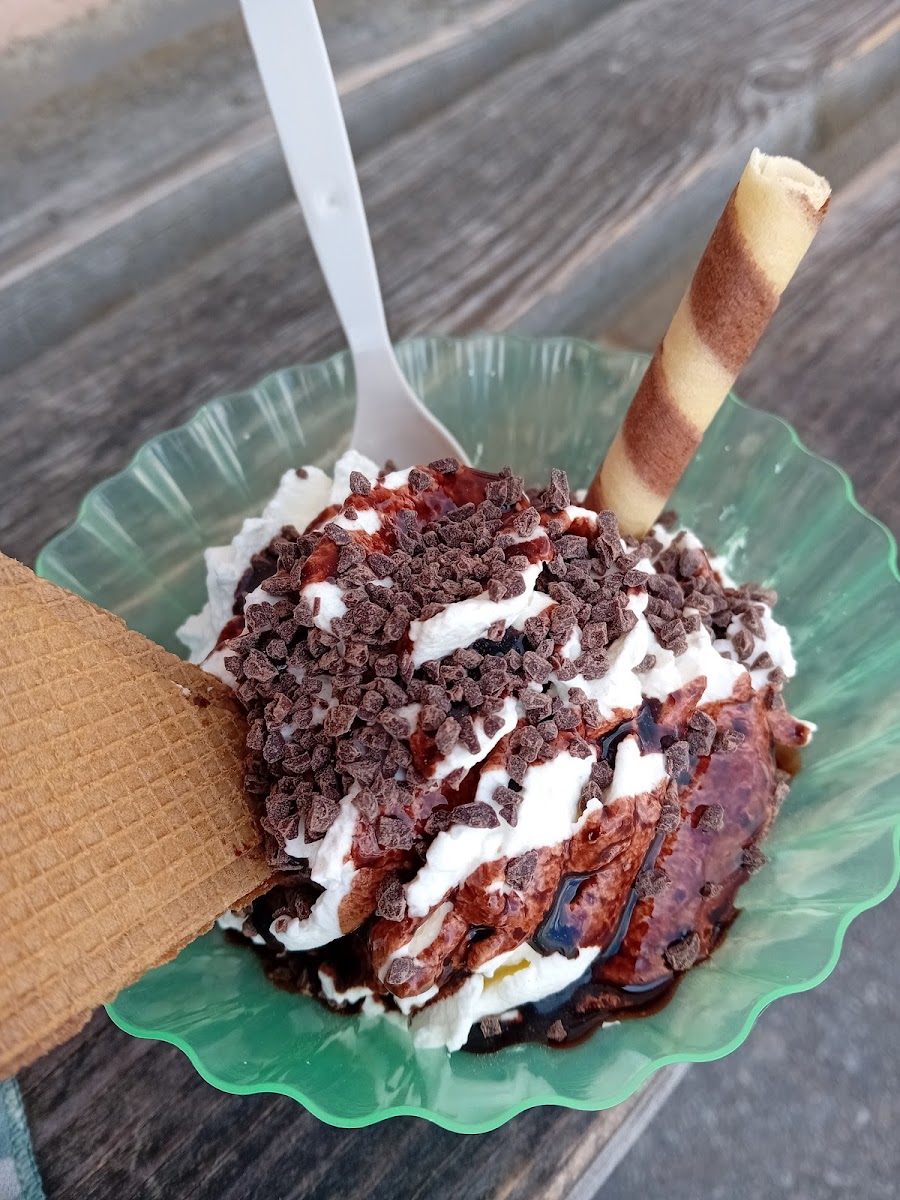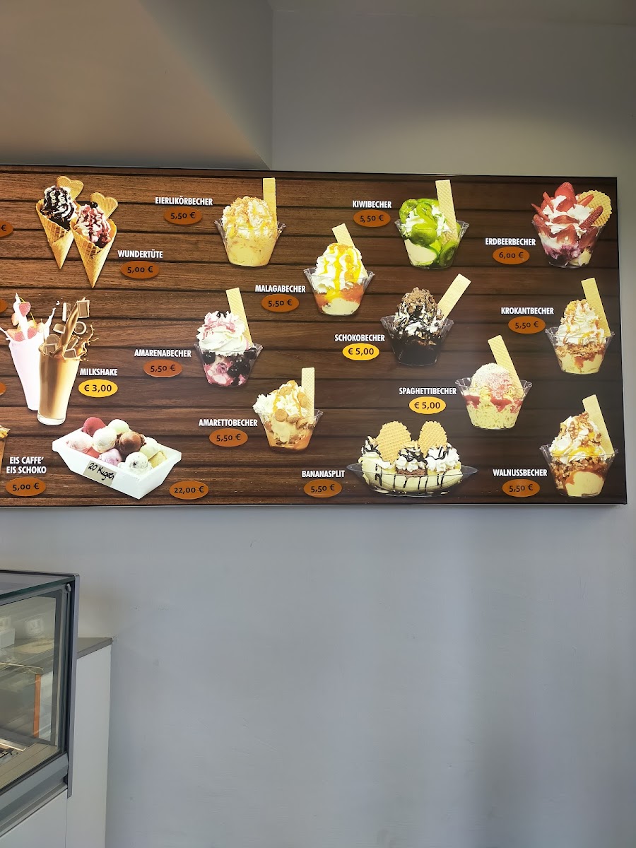 Leckeres Eis - leider nur zum Mitnehmen, wodurch (bevorzugt bei einem größeren Becher) immer Müll entsteht. Die Preise sind (Stand: Juli 2023) relativ günstig im Vergleich zu den anderen Eisdielen. Es besteht keine direkte Sitzmöglichkeit, aber rundherum sind einige Bänke samt Bäume, die Schatten spenden.